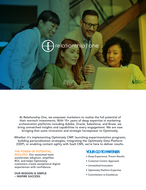 and maximize their marketing investment. With Relationship One as a trusted services partner, Optimizely sales teams can confidently position the platform as a scalable, integrated, and high-performing solution that meets their customers’ evolving marketing needs.